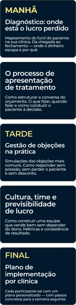Um dia inteiro de trabalho prático. Estruturado para você sair com processo, não com caderno de anotações.